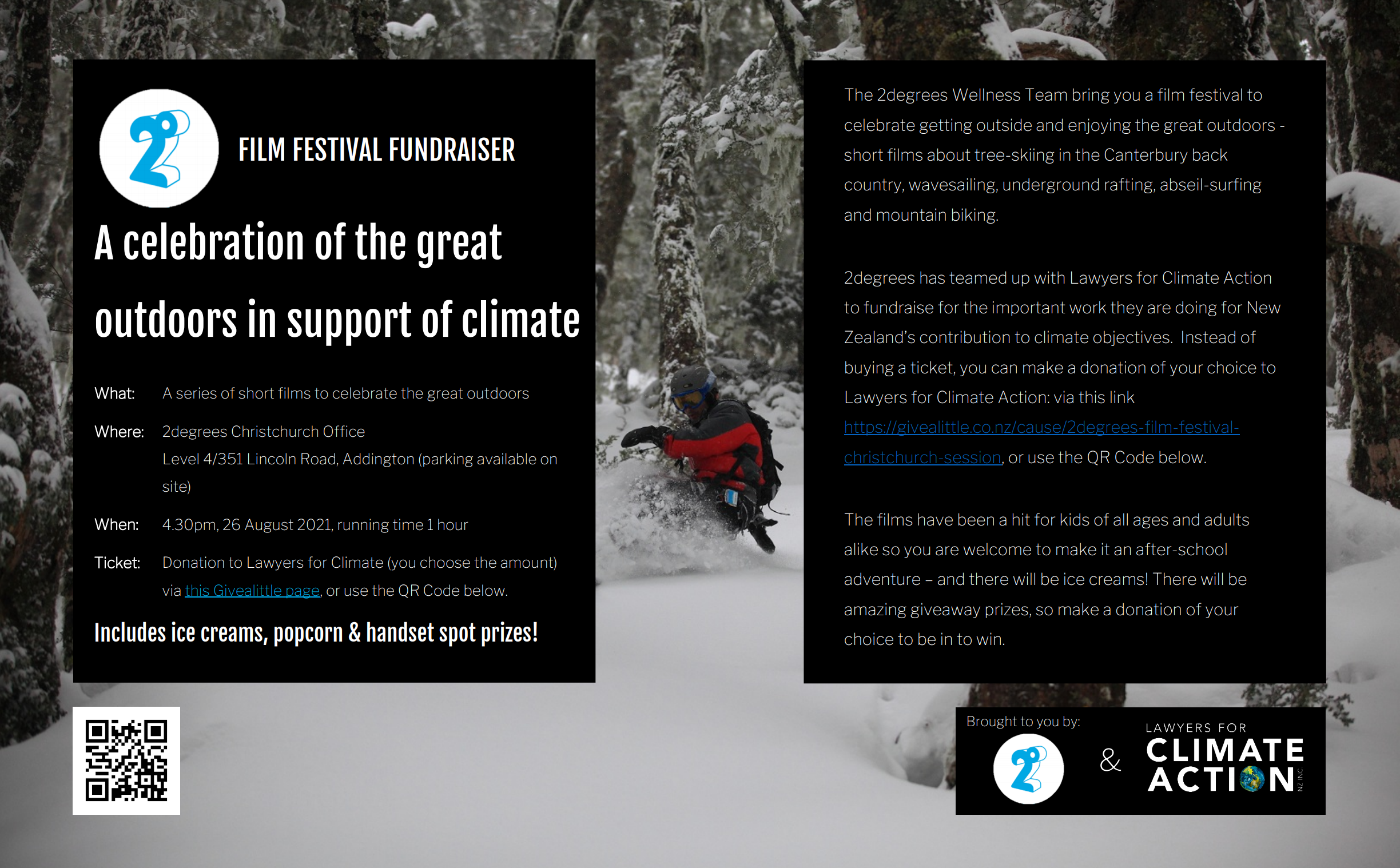 On 26 August at 4.30pm 2degrees are holding a film festival at their office at Level 4, 351 Lincoln Road, to promote wellness and enjoying the great outdoors. They have kindly offered for donations from tickets to go to LCANZI. There will be ice creams, popcorn and phone handset spot prizes. So, we look forward to seeing all our Christchurch members there. Make a donation to this Givealittle page if you want to come (and to be in to win a spot prize!). More info can be found in the flyer below: